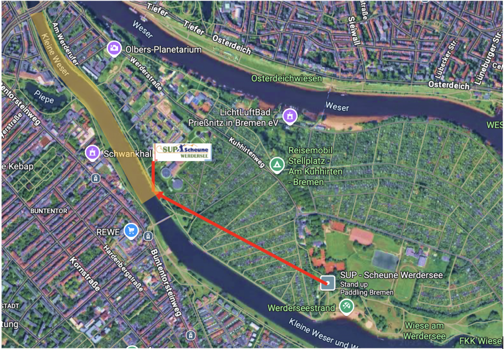 Ab sofort könnt ihr bei uns an der Station wieder SUP´s leihen. Wir sind mit der Station umgezogen an die „kleine Weser“ gelb markiert. Hier habt ihr beste Voraussetzungen für einen tollen Ausflug am Werdersee. Bei Fragen ruft uns gerne an.